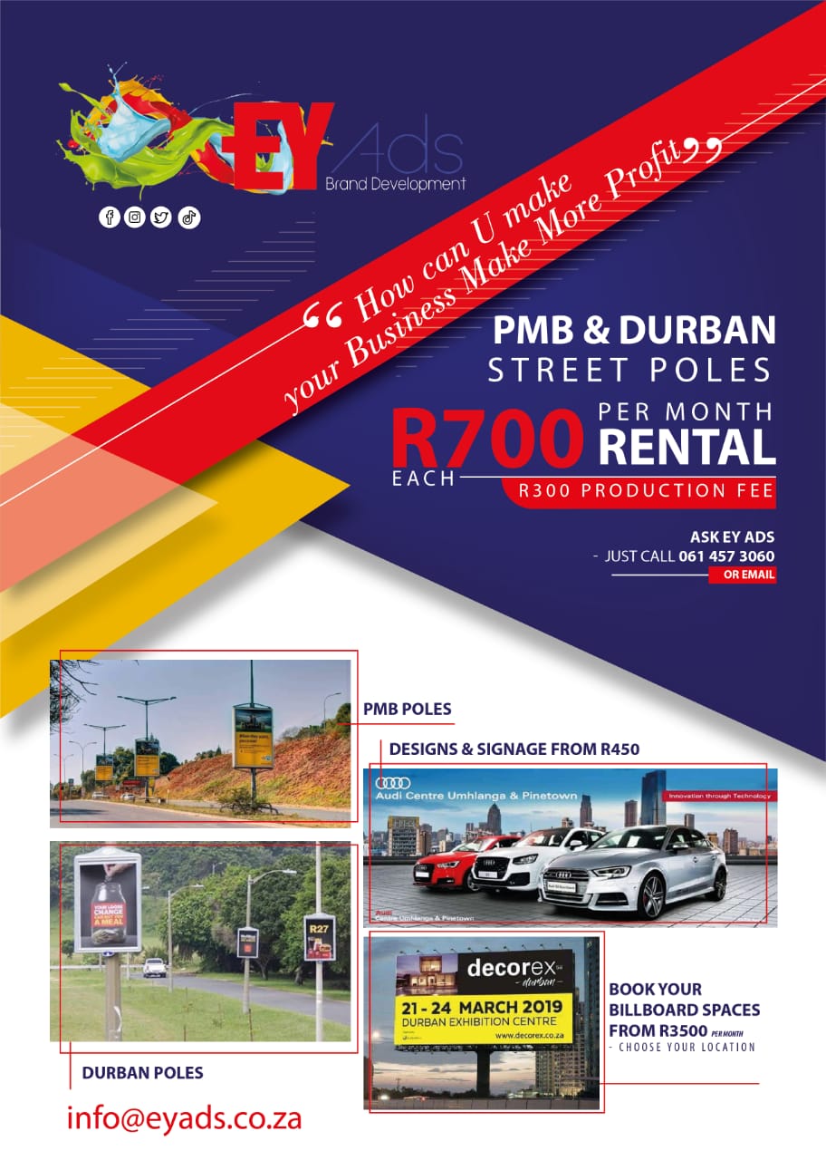 STREET FURNITURE – Litter bin & Street pole advertising these are nitch market brand positioning for information or promotions. Deliver repetitive 24/7 view, in your face exposure in high traffic /pedestrian/ commuter volume routes. Contracts are available in Durban, PMB, Newcastle and Johannesburg CDB, Suburbs and Townships.